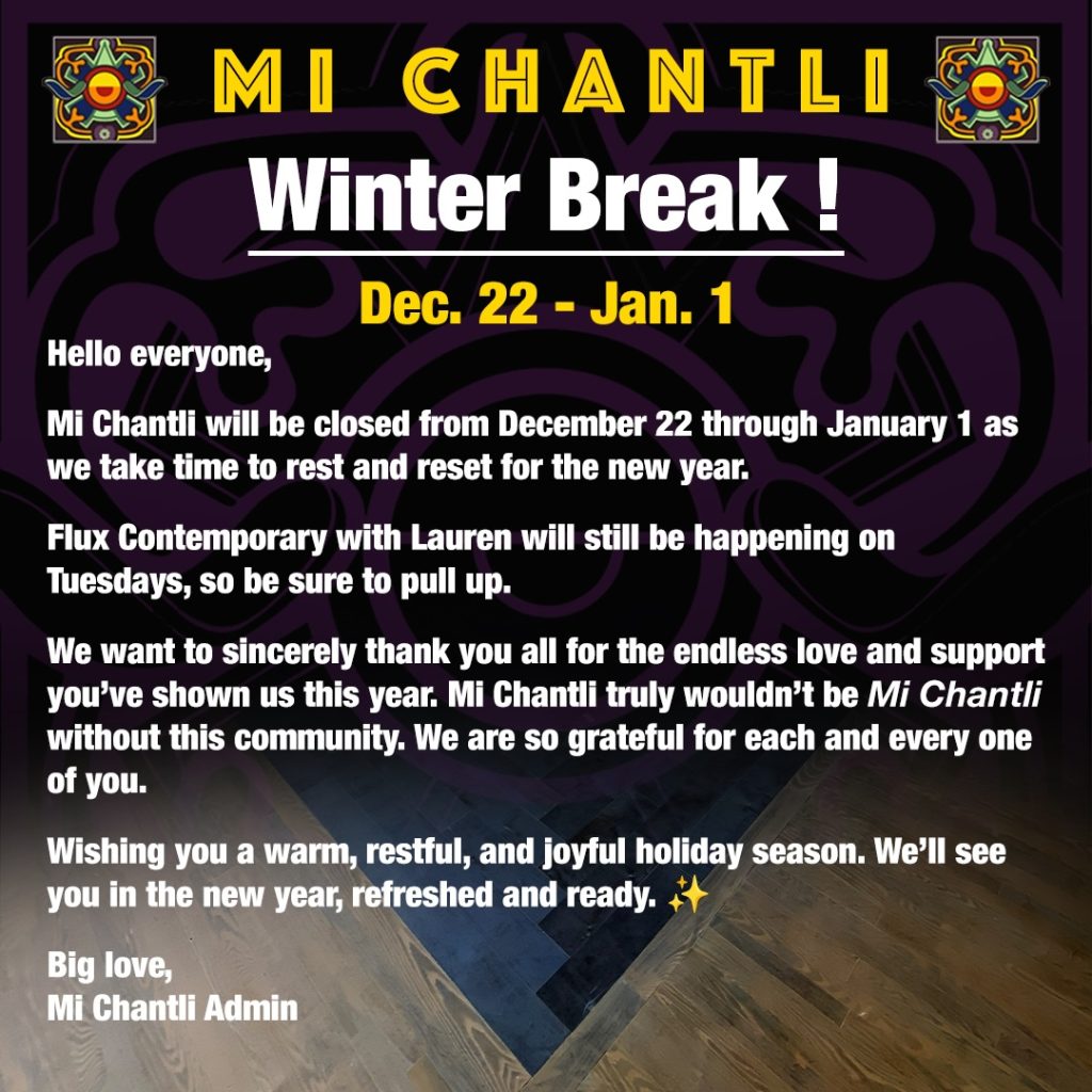 Mi Chantli will be closed from December 22nd through January 1st as we take time to rest and reset for the new year.