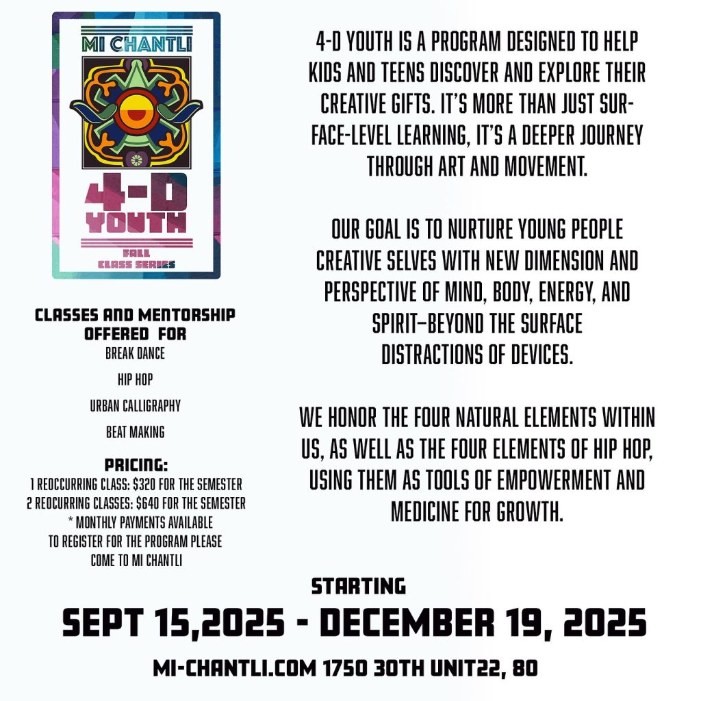 We offer classes and mentorship for breaking, hip hop, urban calligraphy, and beat making through our 4-D Youth. The 4-D Youth is a program designed to help kids and teens discover and explore their creative gifts. It is more than just surface level learning. it is a deeper journey through art and movement.